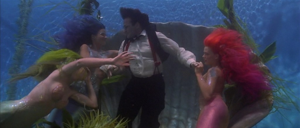Y digo “casi” porque ésos son precisamente, creo, los principales fallos de la película: la fotografía ‒tomas doraditas clásicas de los 90 incluidas‒ y el montaje escénico. Es probable que el look “irreal” de toda la película haya sido deliberado; pero ciertamente no le ayuda en absoluto. Por la forma en la que las cosas están fotografiadas todo se ve falso: las luces de estudio están presentes todo el tiempo, es evidente dónde terminan los decorados y la utilización de cicloramas y telones pintados, los tanques de agua en los que fueron montados los sets son más que obvios, sus maquetas se notan a leguas e incluso se ven los reflejos del agua pintados en la pared del tanque en el que filmaron la secuencia de las sirenas. Quienes construyeron los sets incluso se tomaron la molestia de hacer que el barco de Garfio fuera el único lugar limpio en el pueblo pirata; pero nada de eso importa porque, de todos modos, los decorados terminan viéndose más falsos que los de un parque de diversiones.