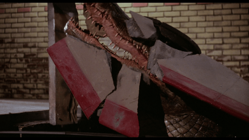 A ese respecto, puedo decir que los efectos prácticos son también disparejos. Algunos han envejecido muy bien ‒este último visionado de la película lo hice en la edición 4K de Scream Factory y se ven bastante bien‒, mientras que otros no. Algunas tomas fueron logradas usando un caimán real en maquetas, otras usando puppets de diferentes tamaños, incluyendo uno de tamaño real, y otras tantas con un bote a control remoto disfrazado de caimán. En general, todas se ven bien; pero la diferencia entre los varios modelos utilizados es más que evidente. Eso sí, la producción tuvo el buen gusto de no mostrarlos demasiado para no arruinar la ilusión.